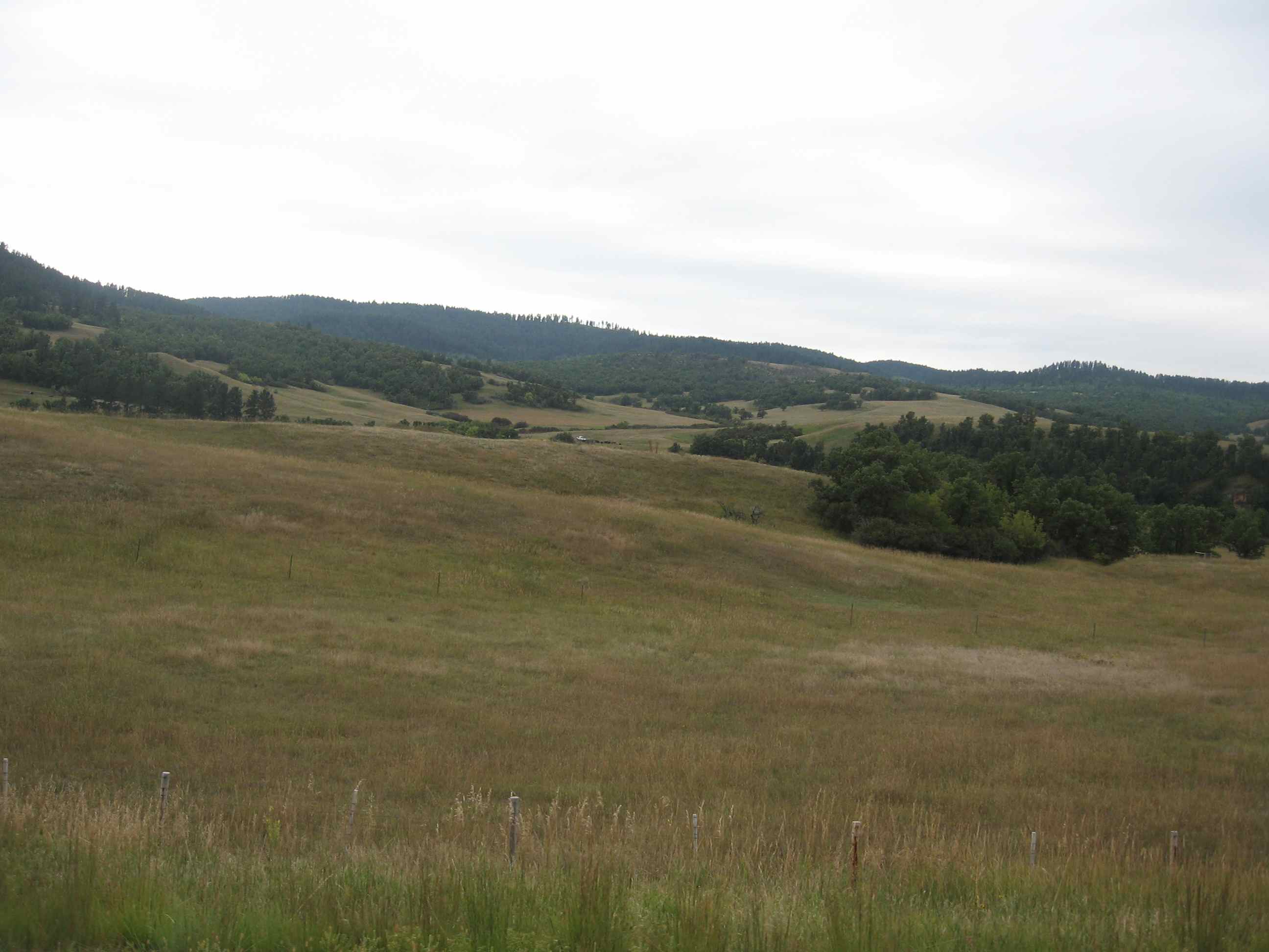 We rode out of the campground around 10:30 am with 65 miles to go to Spearfish, a town about 10 miles east of the South Dakota line. The Black Hills really are black when viewed at a distance, and we rode up and down buttes and through lush green valleys. It was a day of low clouds, and they acted like an acoustic damper; everything was quiet and still. One section of State Route 24 had had its asphalt cracks painstakingly repaired with lines of tar that seemed to wiggle and squirm as you rode over them.