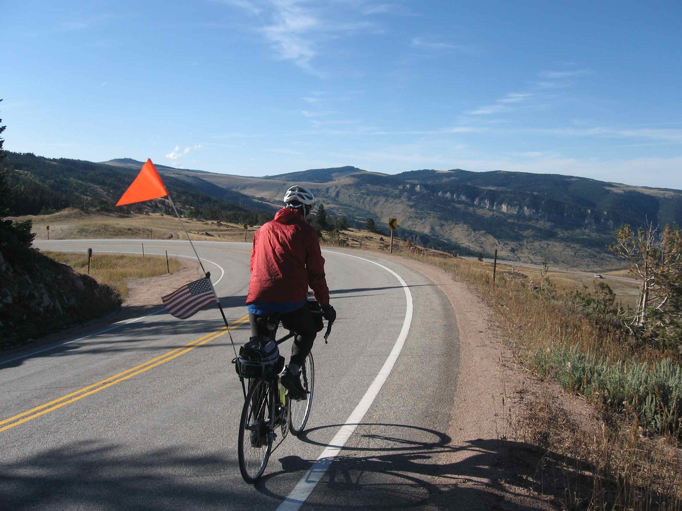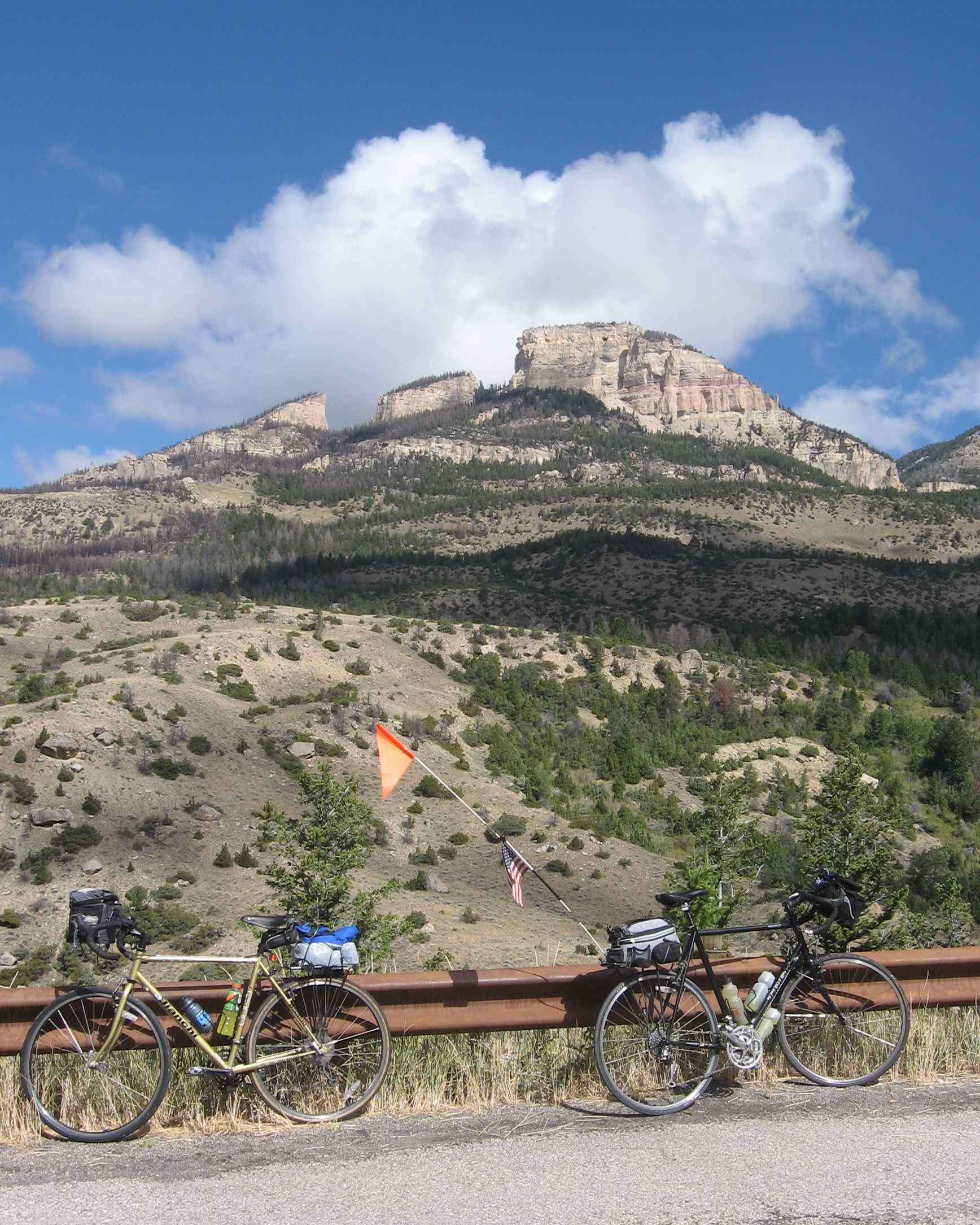 After a few more miles of high-level beauty, we crested the ridge and started down. The Bighorns are not part of the Rocky Mountains. They are out in the middle of Wyoming, all by themselves. Still, the view of the plains you get from the top looking east rivals the view from Pike’s Peak or anywhere else on the Front Range. We picked up speed, banked into turns, watched for rocks and oncoming cars, braked when things got too fast, and kept going down, down, down for 45 minutes without pedaling more than a few times. Near the bottom, I pulled next to Jim and he screamed, “this is way too much fun!” I felt like a ten-year-old Cub Scout in the soap box derby.