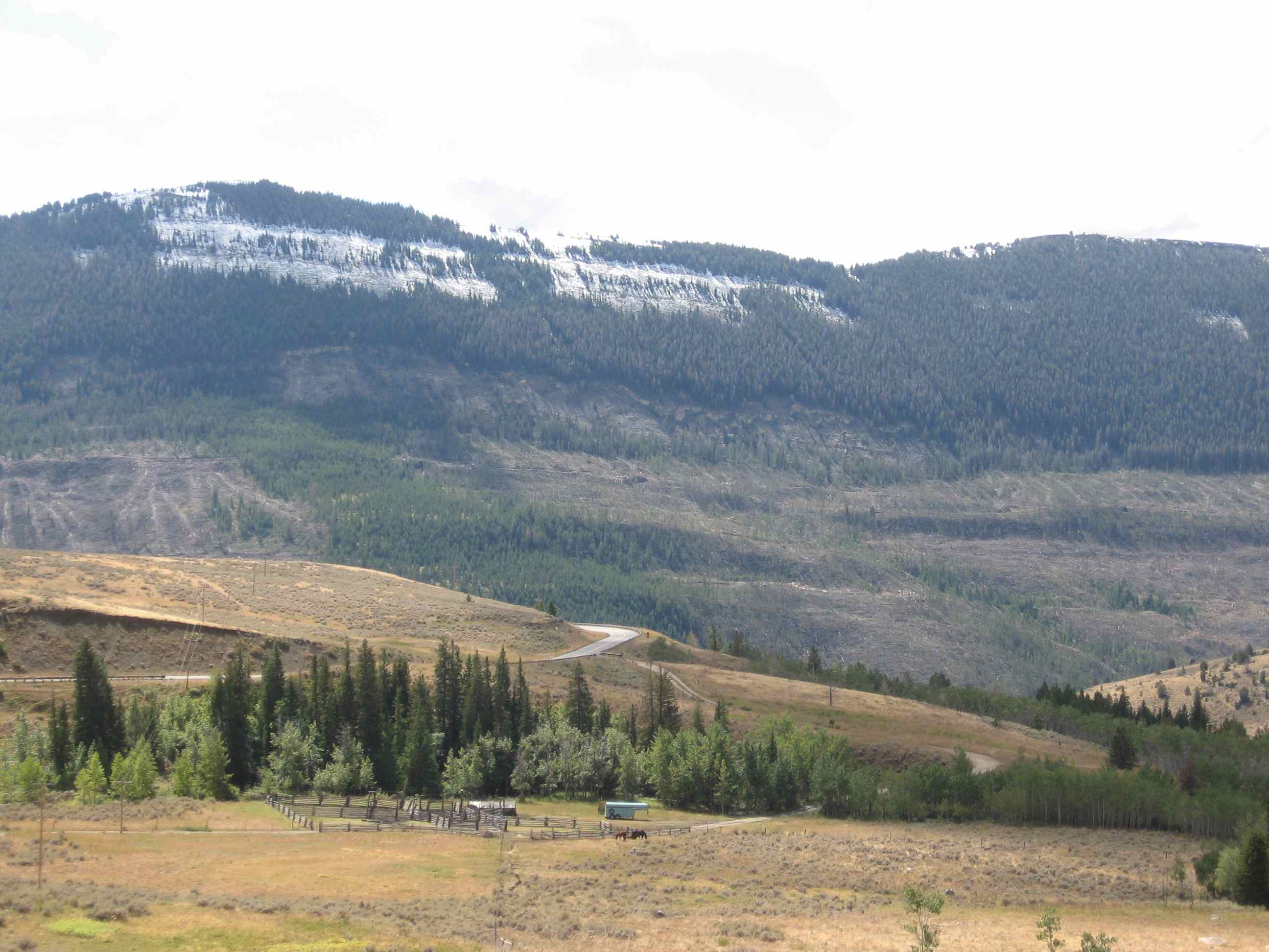 After several thousand feet of climbing, with the peaks looming higher at every turn, I came across what looked like a large clear-cut in the pine forest, right in the middle of the scenery. I thought it was maybe the dumbest public timber sale in history until a plaque informed me that the Western Spruce Budworm had denuded the hillside. Budworm larvae attack drought-weakened pine and fir trees, and since the West has been in a long drought, they’ve done a lot of damage. Dead trees were removed from this hillside, the plaque explained, to reduce fire risk. Several people told us that the rains we’ve been complaining about are actually a blessing, the first wet year the West has had in a decade.