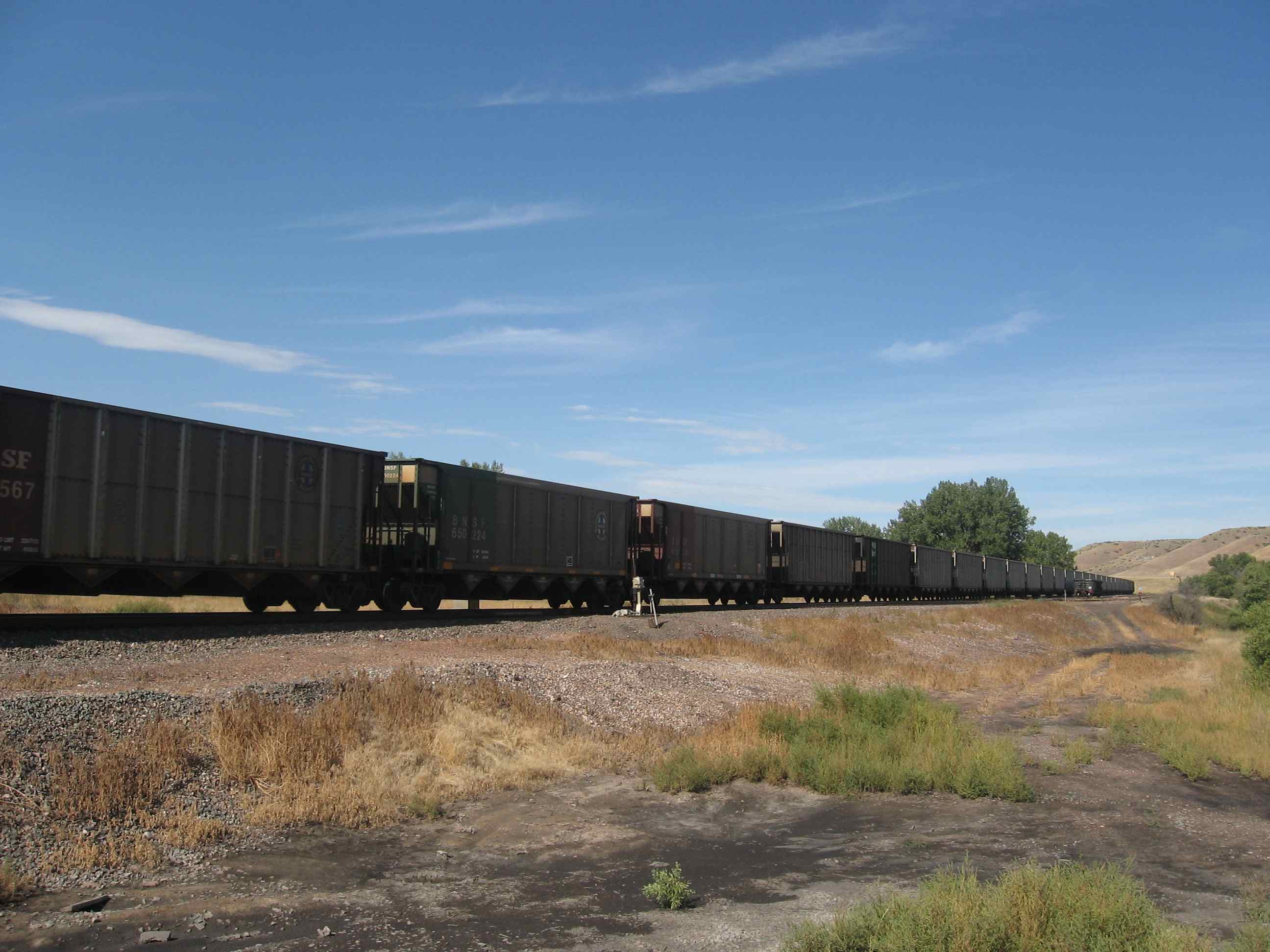 We slept late and dawdled around again on Tuesday the 9th because I had an appointment with Back Country Bicycles in Sheridan, 15 miles down the road. They were going to install a new back wheel on my bike, but UPS wasn’t going to deliver the thing until around noon. We rolled out of the campsite around 10 am and headed south, unsure of how to get to Sheridan without riding on Interstate 90. We started on a paved frontage road that was near the railroad tracks. Every half hour or so an enormous coal train, perhaps half a mile long, would rumble past. Coal and natural gas are the main engine of Wyoming’s economy, and the size of these trains dwarfs anything you would see back east. They have four engines in front, three in back, and sometimes one or two in the middle. They are so long that often the front end is going downhill while the back end is going uphill. John McPhee wrote a great essay about driving these rigs for The New Yorker a few years ago. By the end of the piece, you realized that he was really talking about the lengths we will go to in order to have ample supplies of electricity.