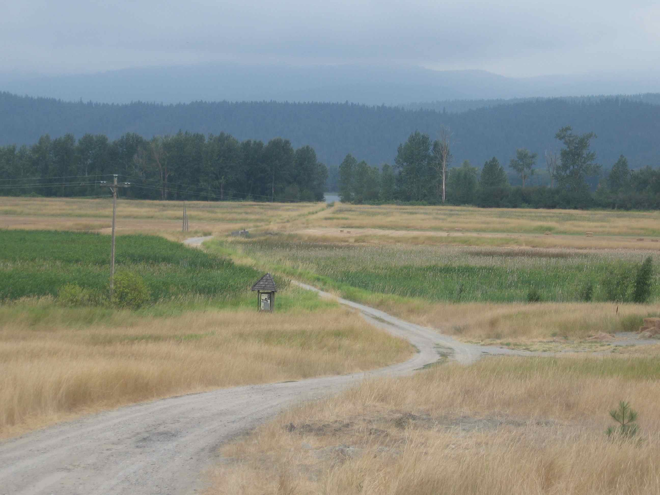 Around 9am we entered the Kalispel Indian Reservation. The contrast was dramatic. Where we had been riding past ranchettes and old farms, at the border the land opened up and an open field of 440 acres stretched down to the shore. A sign explained that it was a wildlife mitigation project, paid for by the Bonneville Power Authority and managed by the tribe, to compensate for the loss of habitat caused by the construction of Albeni Falls Dam. The tribe is managing the land for geese, mallard, muskrat, deer, eagle, yellow warbler, and black-capped chickadee. A few miles up the road we got a quick overview of the Kalispel’s ambitious plans for the environmental restoration of their ancestral lands from Deane Osterman, the tribe’s Director of Natural Resources (see separate post).