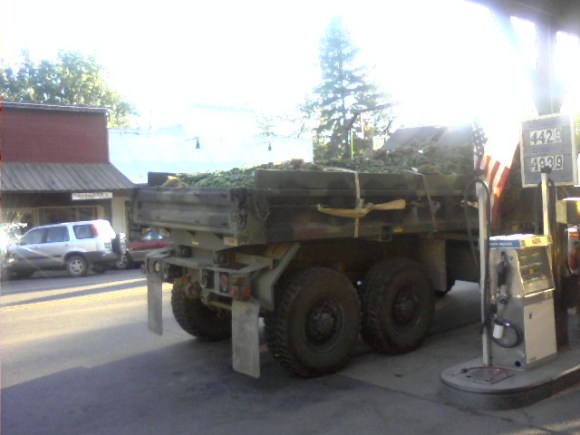After 90 beautiful but extremely hot minutes, we pulled into our destination for the night, the town of Winthrop. It is both the regional center and a major sink for tourist dollars, and everyone on main street seems happy and well-fed. Earlier that day we had seen cops in soldier uniforms massing at the side of the road in a couple of places. Perhaps the military dump truck loaded with marijuana plants that we saw at the gas station that evening was their day’s work (below). Although the cop guarding the haul was very nice, he wouldn’t say.