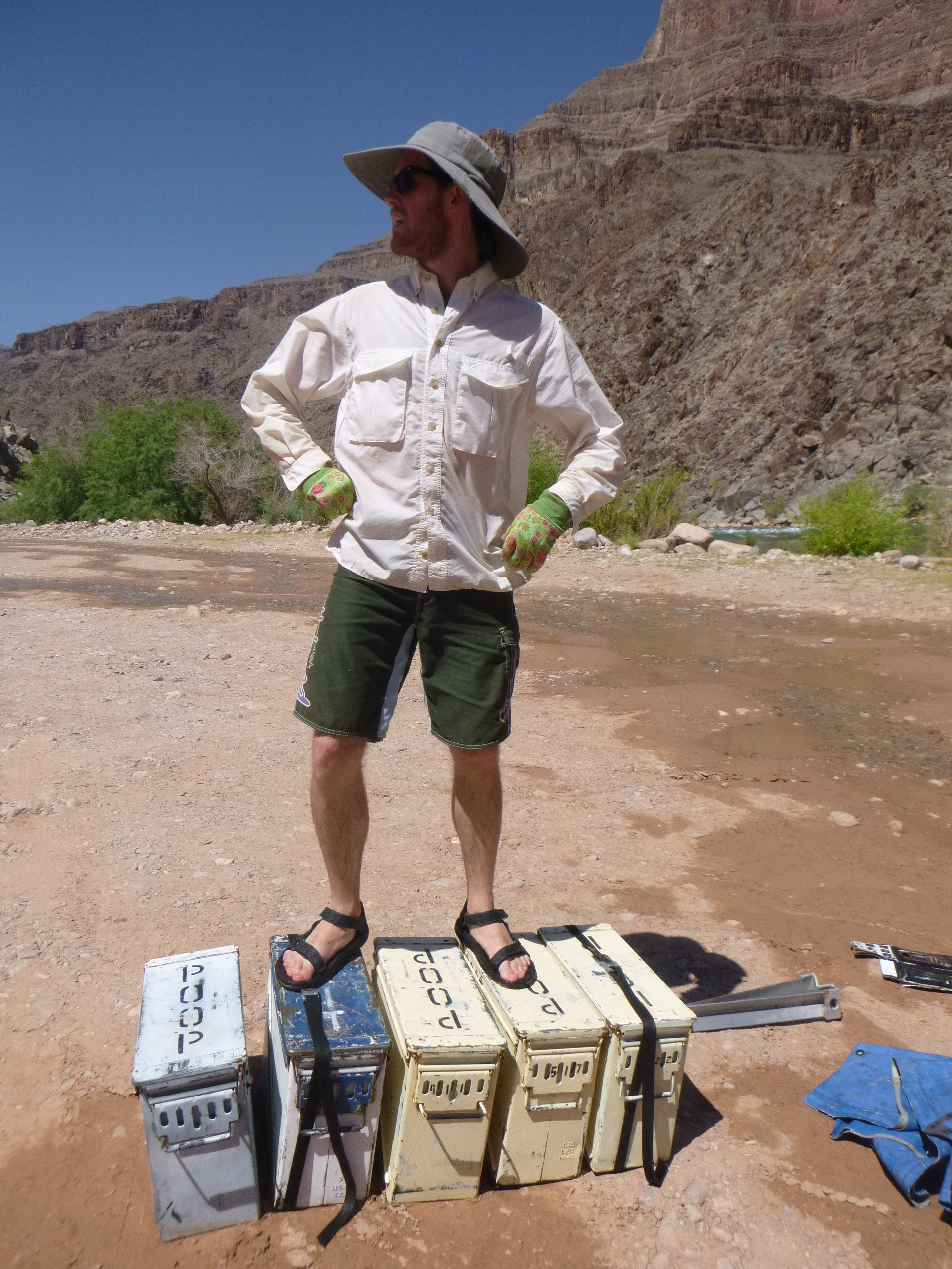the rafts, including five ammo boxes, each packed with 50 pounds of our shit; five enormous Yeti coolers, some of which still had ice enough to keep cheese, meat, and a few soggy vegetables cold; the heavy steel frames that kept the rafts rigid; the kitchen; a dozen 12-foot oars, plus two spares; all our personal gear; and the rafts themselves, which had to be deflated, which involved lying on top of each section to force the air out, then rolling the vinyl up,