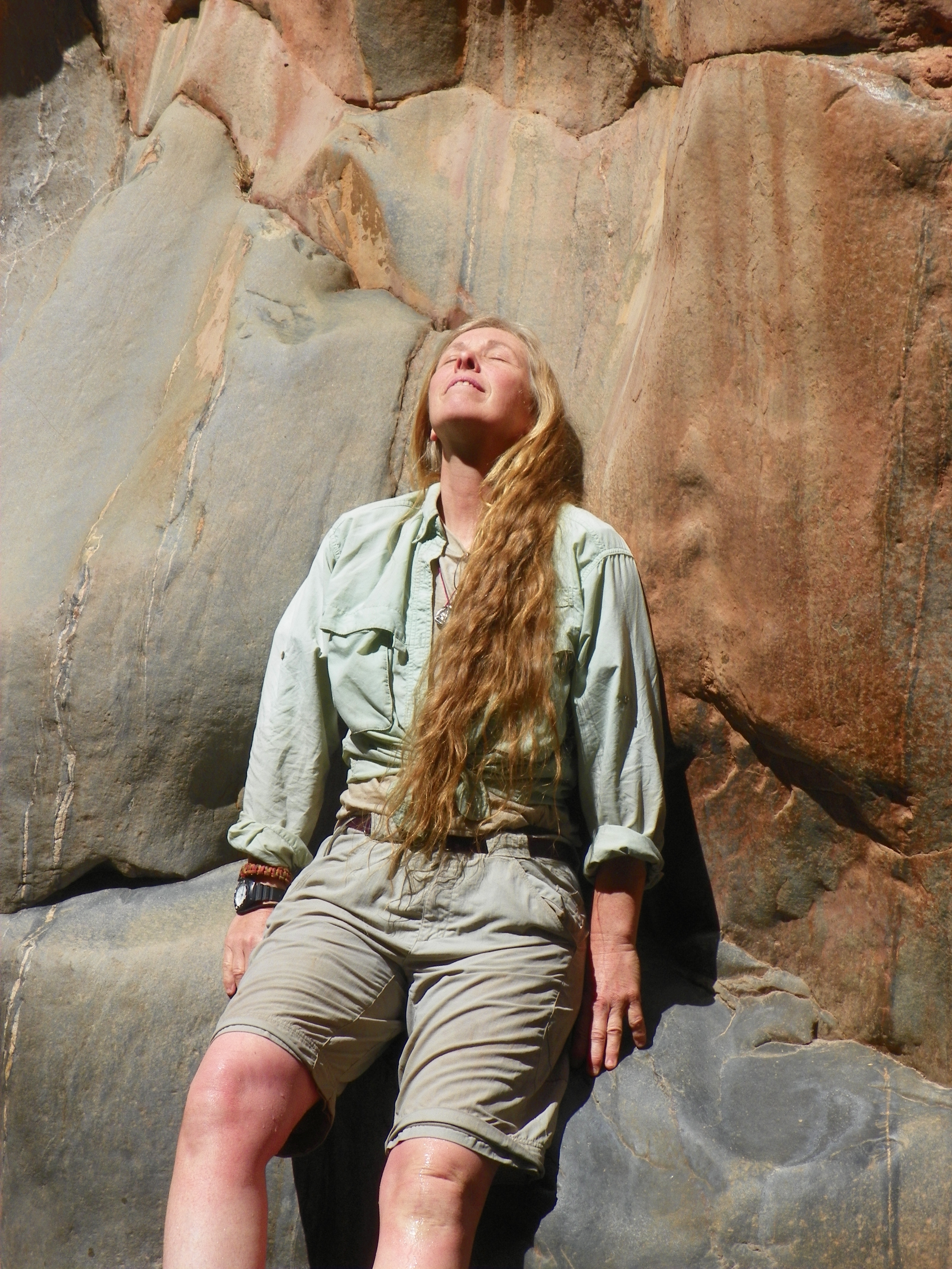 There’s a picture. We were halfway through the canyon. I had quit thinking about home, I wasn’t thinking about going back. Whatever concerns I had about putting the trip together were gone. Leaning back against the rock in the sun, I was clean and feeling chilled from swimming, the warmth of the sun, sublime. The patter of the waterfall echoed off the walls, punctuated with bits of happy voices.