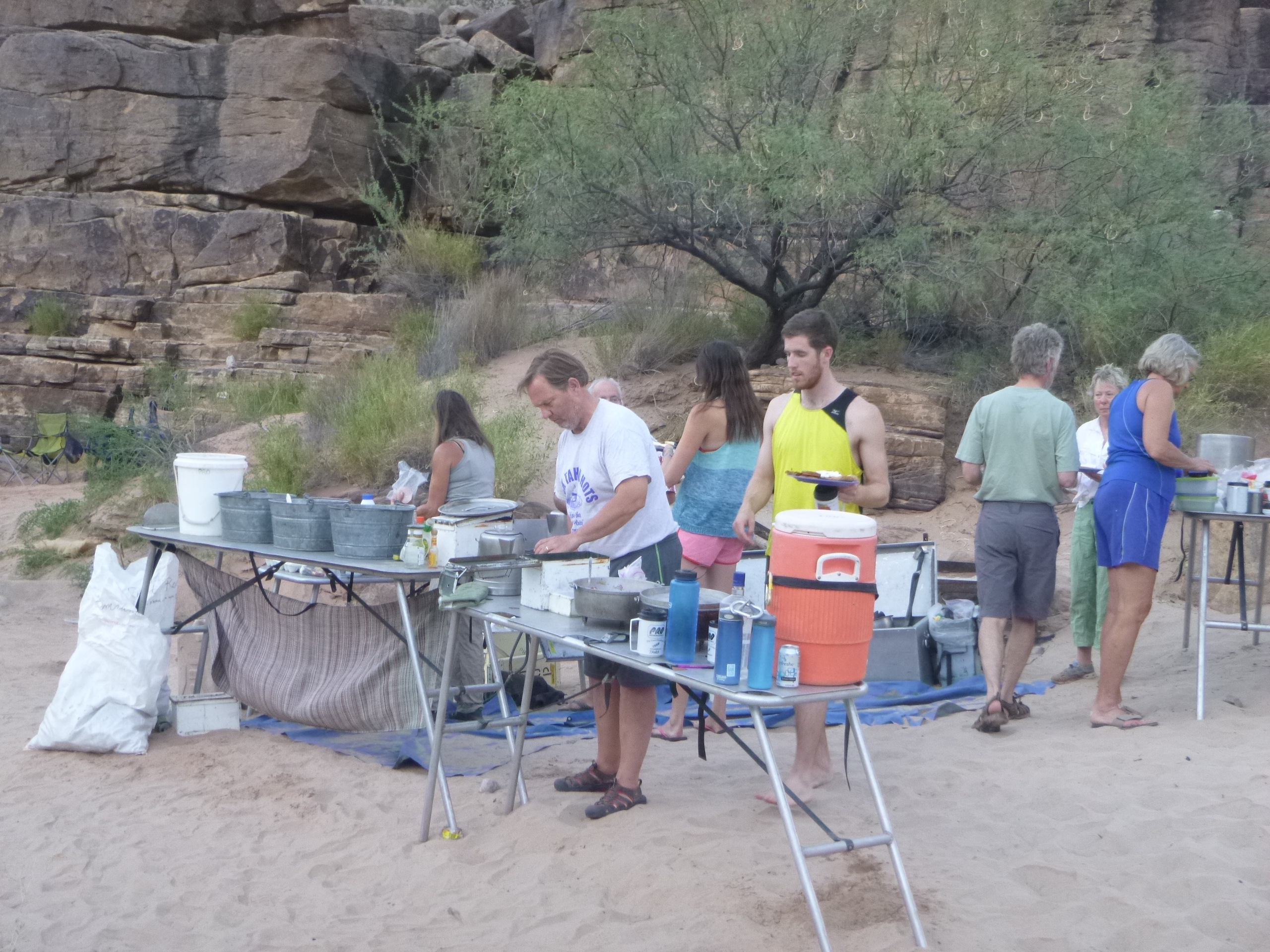 To my knowledge Peter has never engaged in a practical joke. Things are what they are. He has organized the trip with honesty, hard work and a sense of duty. He has inspired trust. So when Peter looked upstream into an empty, peaceful river yelling “Here come the commercials,” utter panic erupted. Several people so believed in Peter that I think they actually saw boats in the river. There were none. We all fell over with laughter. The camp is in shade now so it is time to move. Dinner is stir fry out of cans and excellent. We still have carrots, onions and celery, we still have ice. Appetizers are a smorgasbord of tinned fish, grape leaves and cheese.