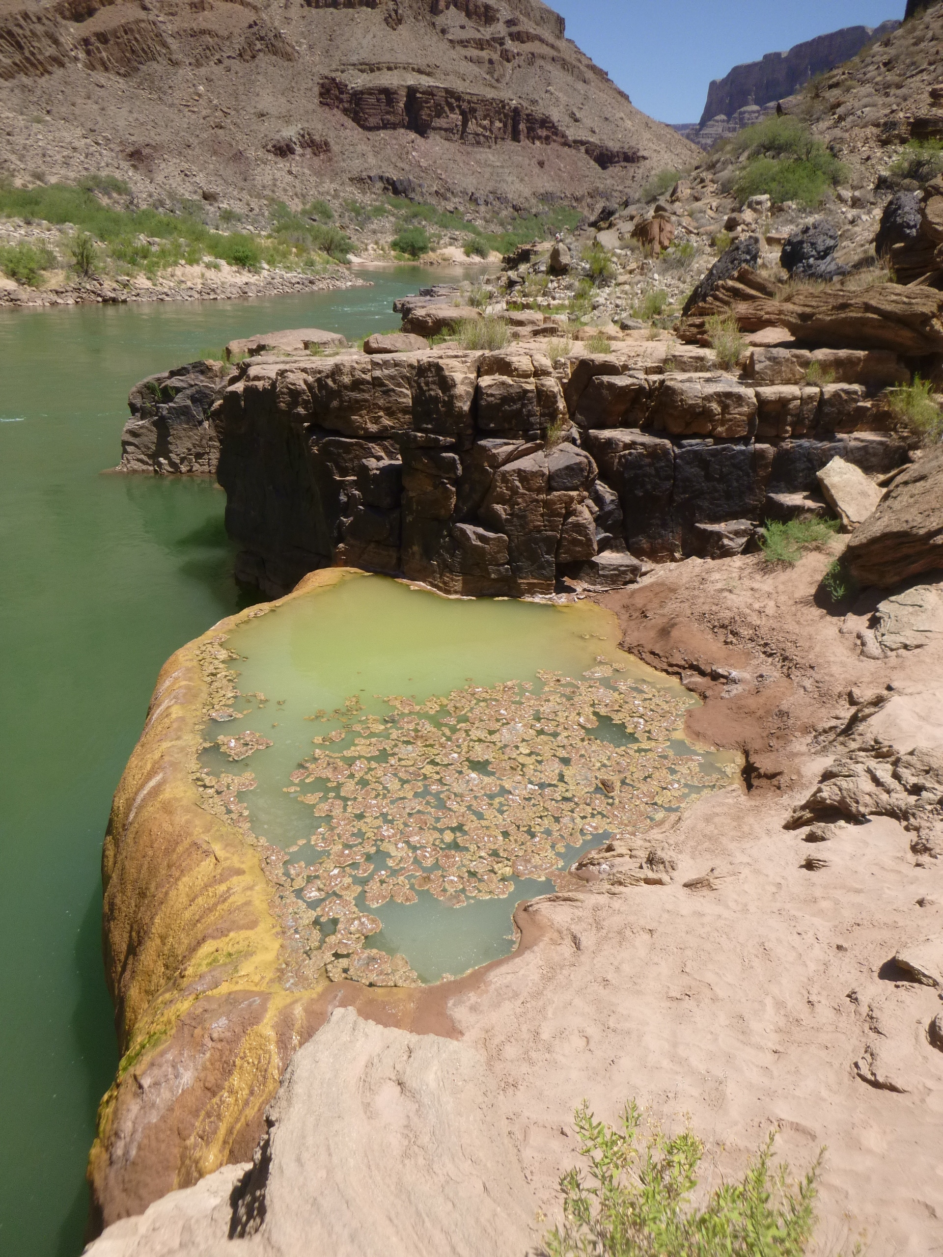 minutes then slides beneath the surface. We pull into Pumpkin Springs. From the river it looks JUST like a gigantic wet pumpkin. The spring sits in a single travertine bowl over which the water spills in a glossy sheet. The spring comes up through enough rocks that were once lava that in addition to the travertine, the water picks up a brew of truly toxic elements that stain the edge in shades of orange with streaks of brown. Today there is not enough water flowing over the edge to keep the top of the spring clean. Patches of ripe algae cover it. Little bubbles of gas dance to the surface, it smells of sulfur. This feels like a side trip to a sewage treatment plant.
