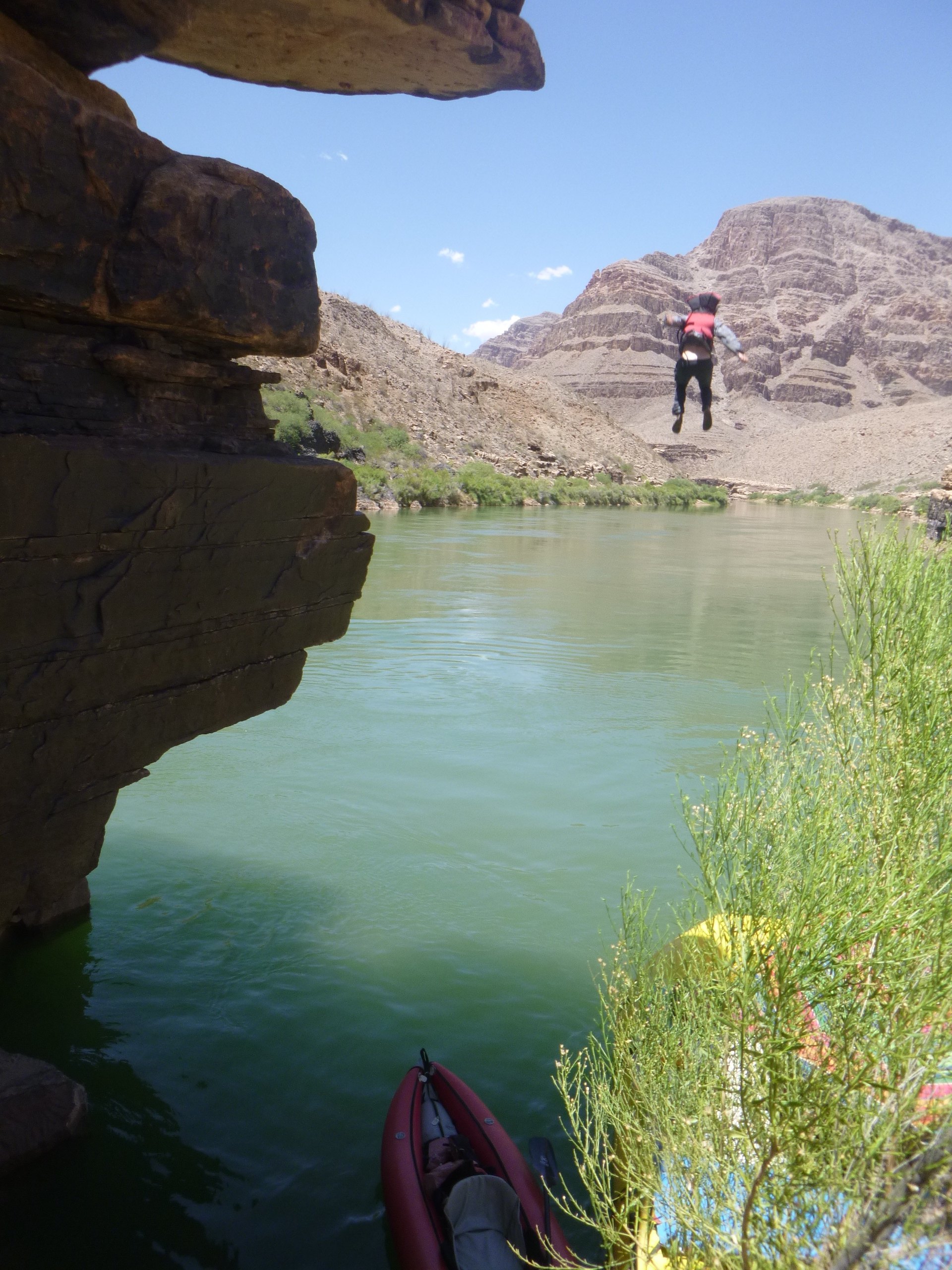 A few miles farther downstream Three Springs Canyon entertains us for the rest of the afternoon. The cliff face guarding the canyon on the upstream side is undercut by the current, making a shady basin under a 50 foot overhang used for long jumps into the river. Thanks to Jim’s super spiffy camera this is captured in high speed splendor. The year round spring on the other side of the overhang finds its way to the river in a gentle notch lined with vegetation. A