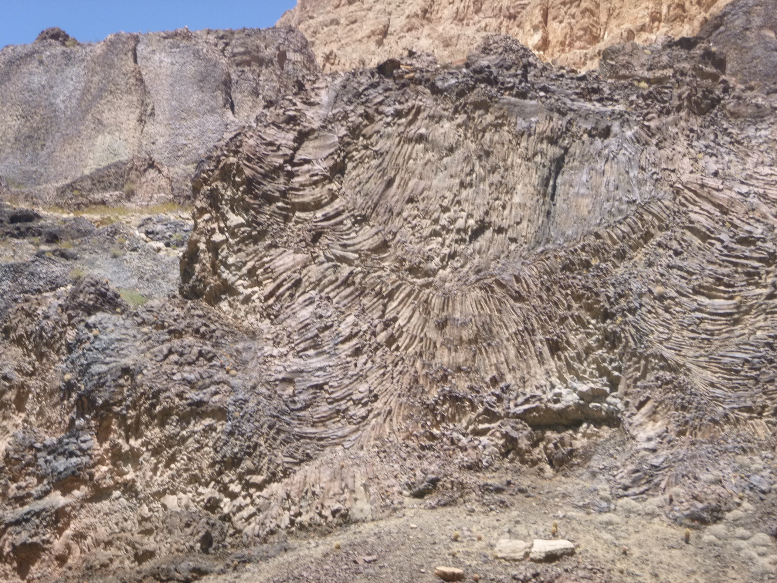Pedro started rowing again; we turned a corner, and the canyon widened dramatically. We floated past a huge rockfall on river right known as “The Red Slide,” where a cliff of Supai sandstone slumped onto a beach (click here to see it in 3-D!). Shortly afterward, our world changed again when the Uinkaret volcanic field appeared. Suddenly the rocks at river level changed to basalt – they were black and jagged like congealed floor adhesive, looking as hot and nasty as a rusty