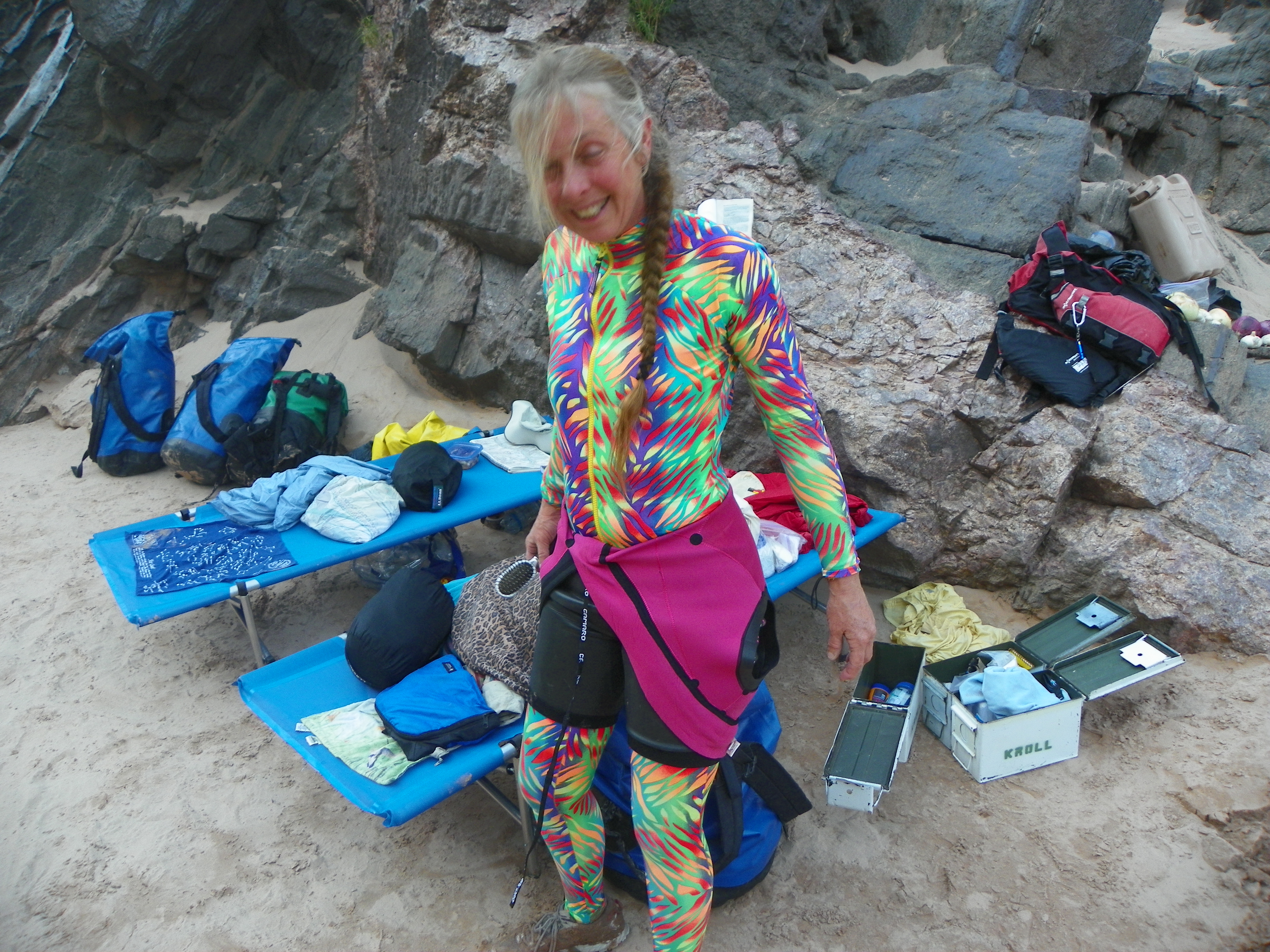 This was The Big Day for rapids. We went through four major ones: Horn Creek (rated 8 out of 9), Granite (8), Hermit (8), and Crystal (9). After that came five smaller ones in succession: Tuna, Lower Tuna, Agate, Sapphire, and Turquoise. As we packed up, everyone was thinking about the swimmers we plucked out of the river on Day 7. Nan put on the green wetsuit she called her “Gumby suit,” and