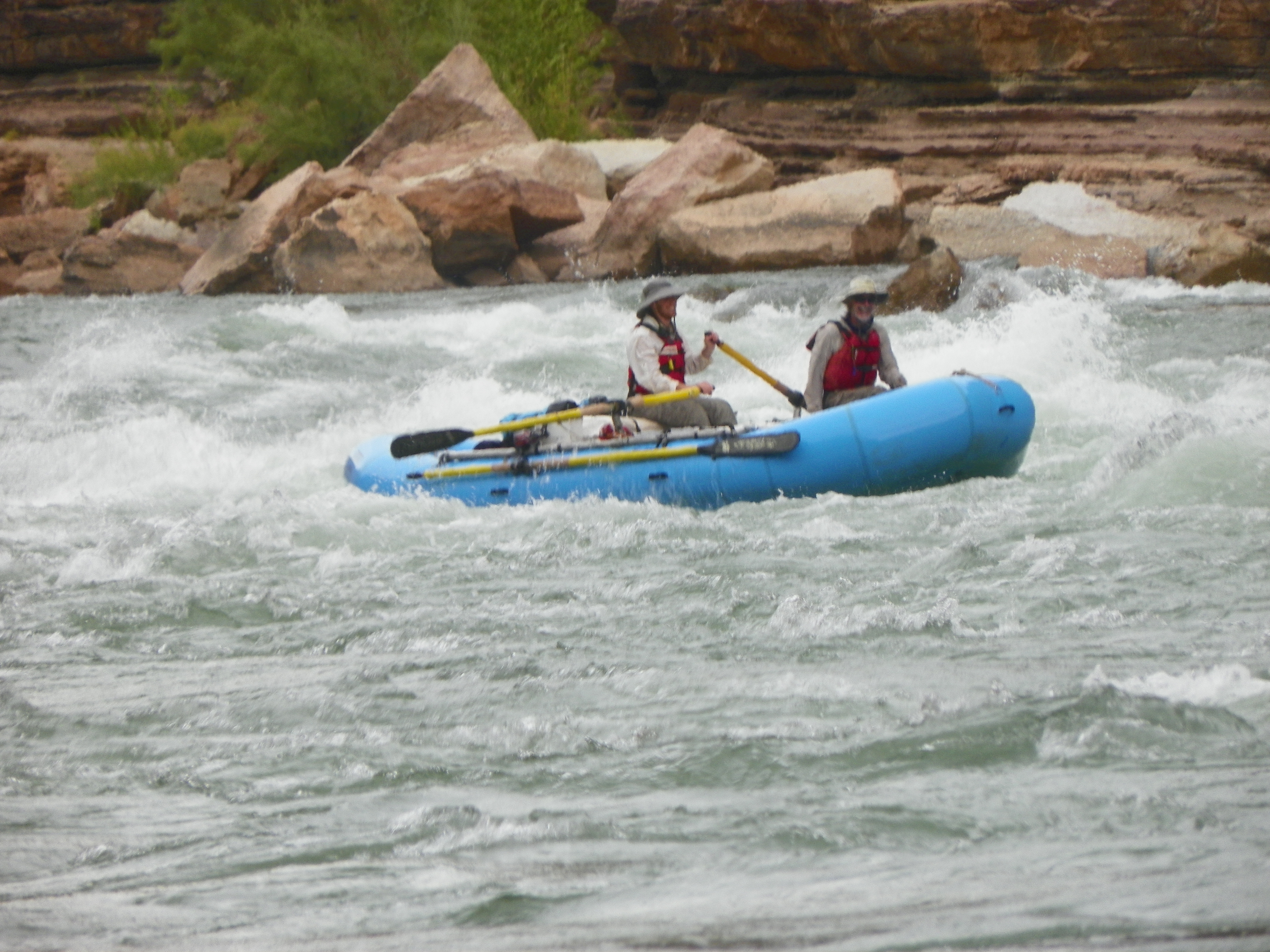 Each big rapid is like a problem set. Horn starts with two exposed rocks in the middle of the river at the top of the rapid. At higher water, Rod explained, rafters can run through the middle. But today the flow was lower, about 8,000 cubic feet per second, so the only possible run was entering on the right and then pulling to the left.