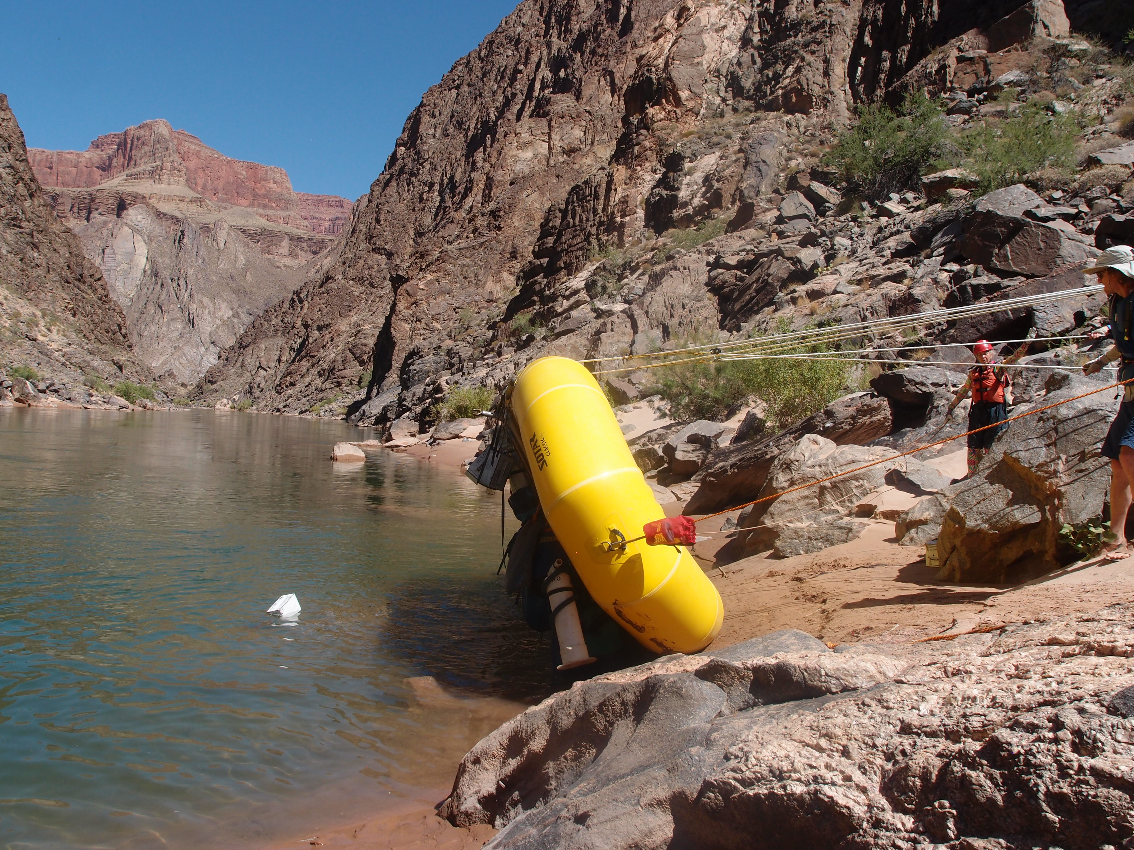 and Jim Kirchner both have advanced engineering degrees, Pete and Christie are skilled with rope rescues, and Rod knows rafts. Still, it took an hour for them to flip the thing back over (with Mel taking pictures). They strung up a 3:1 haul system, also known as a Z-rig, which used the pulleys in such a way that hauling three feet of line lifted the boat one foot. The rest of us sat around on a tiny sand spit until the raft was right-side up again, so we could survey the damage.