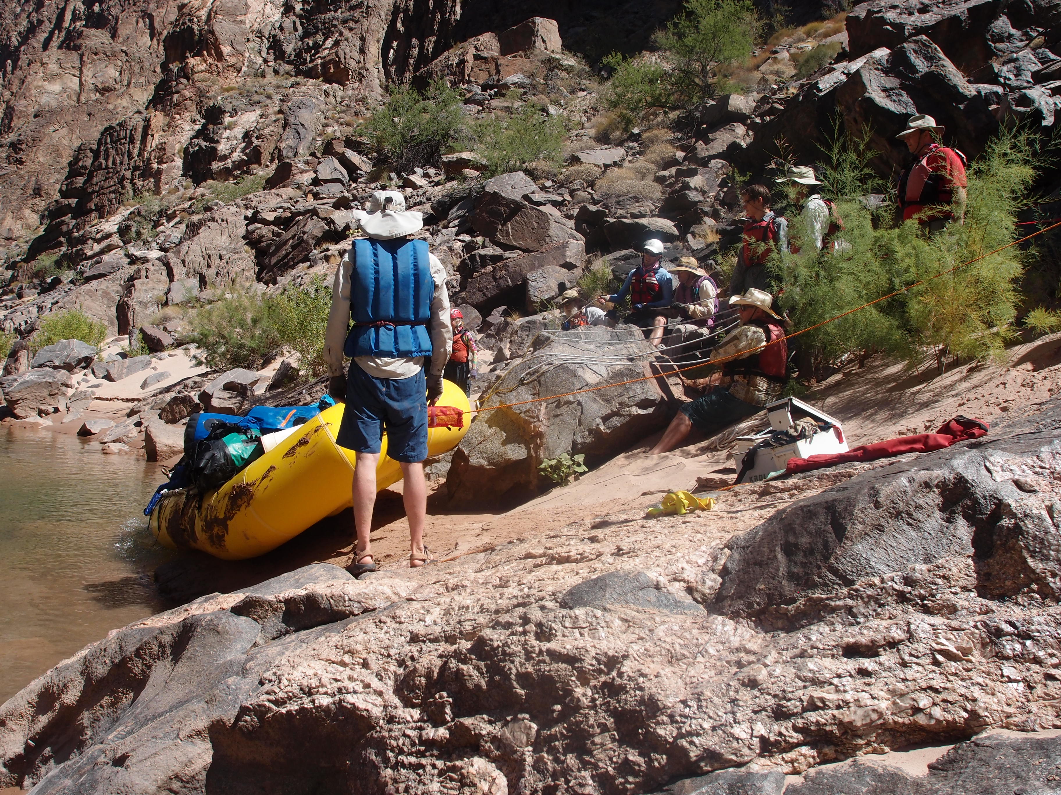An 18-foot raft is about 7 feet wide and, loaded, weighs upwards of 1,000 pounds. Rod, who had seen this kind of thing happen before, had packed a rope and pulley system. Peter, who always seemed to be thinking about disasters, had packed ropes too – but they were in his raft and were now underwater. So we used Rod’s rig.