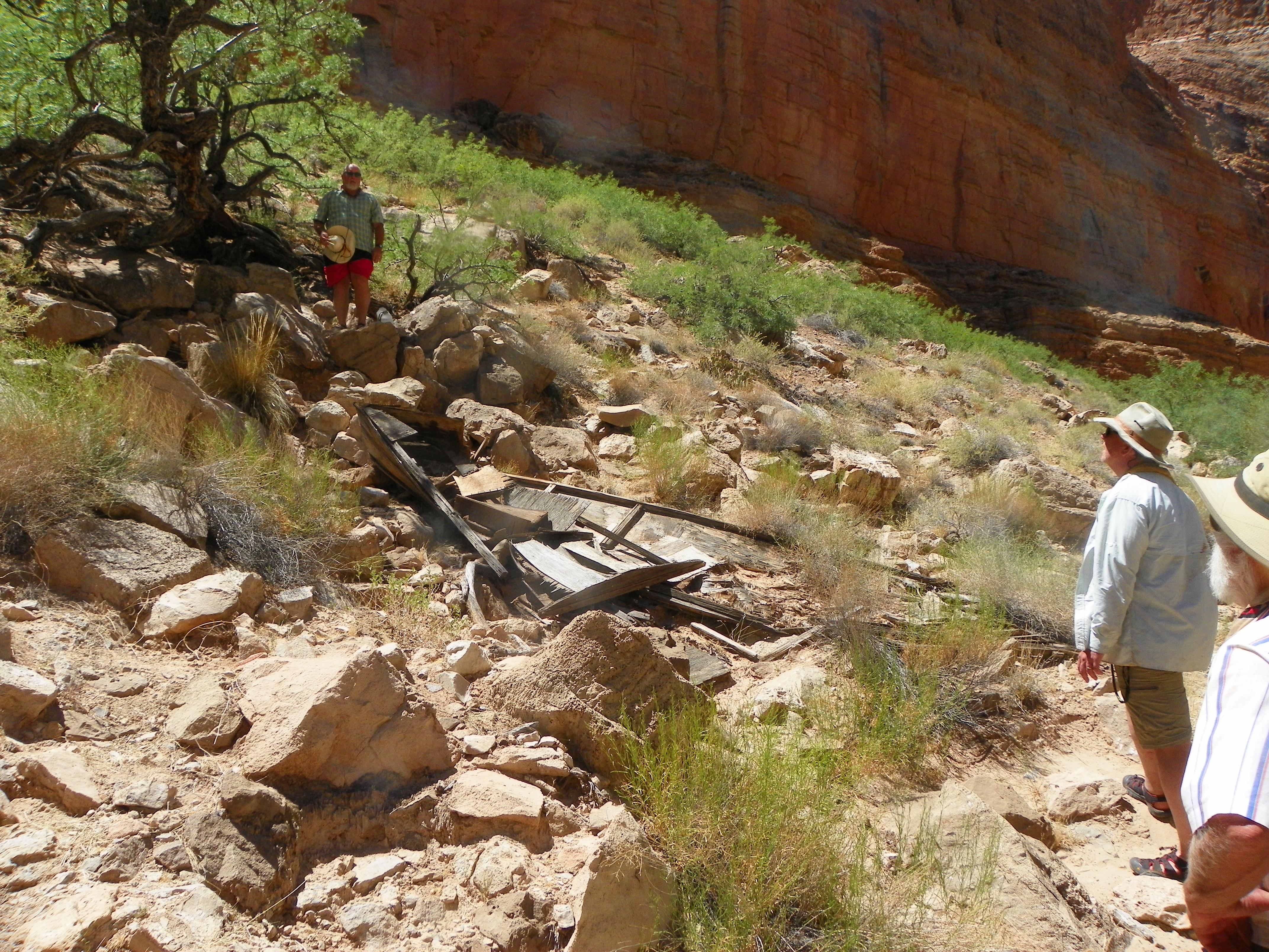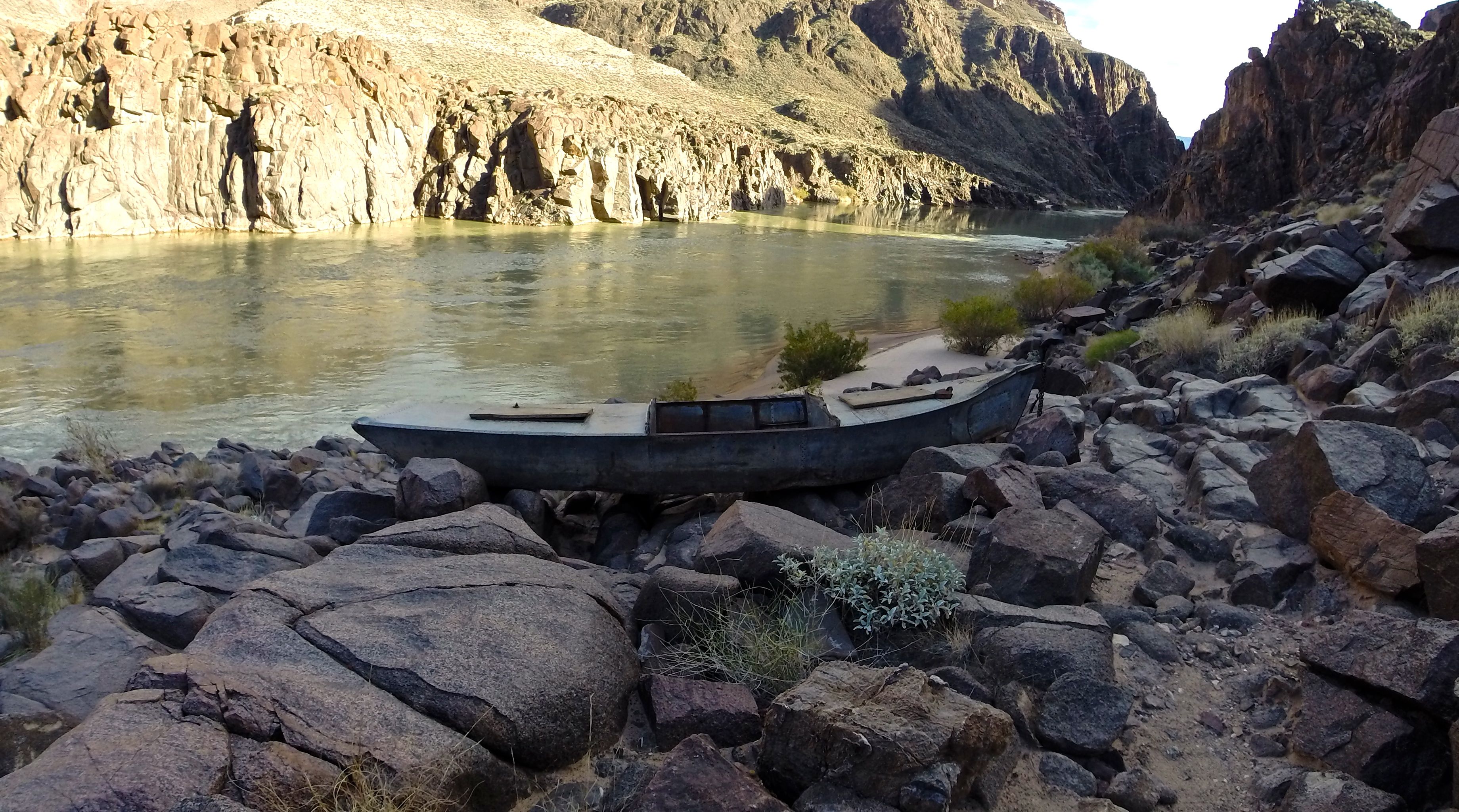 We scouted Granite by walking through a brutally hot beach held in place by dead trees. The sand was eroding back from higher levels probably deposited during one of the high flow experiments, where up to 90,000 CFS are released from Glen Canyon Dam for a few days in order to stir things up and replenish the beaches. The experiment also aims to get rid of invasive tamarisk so native plants can come back in. The beach had native trees planted in rings or cages, and jugs were nearby for watering them. Perhaps a third of them were dead anyway. Even with help, this is a tough place to live.