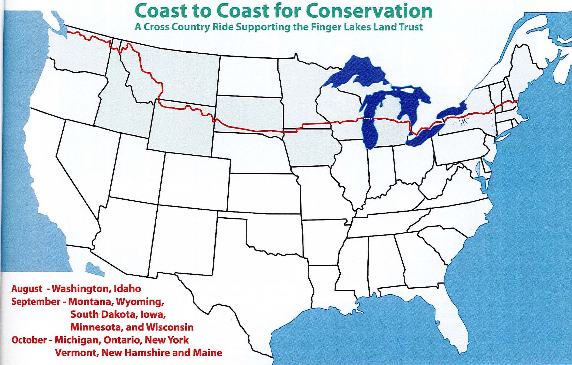 On August 10, 2008, I spent the day looking out the window of a westbound cross-country flight headed for Seattle. The plan was to meander back east through the same terrain, but on the ground this time, and much more slowly. It occurred to me on the plane that I had done something similar to the bike ride a year earlier, when I hiked 82 miles of the Finger Lakes Trail in six days. I walked through some of the most beautiful land in Central New York, where I’ve lived most of my life, beginning just east of Watkins Glen and finishing near Cortland.