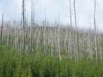 The fire destroyed thousands of acres of lodgepole pines. But the trees are well-adapted to fire, so their cones open and release seeds when heated to 113 degrees. Twenty years later those seedlings are eight feet tall, with their dead ancestors still standing above them. Stands of larch trees were more likely to survive because they have thicker bark and replace their leaves every year, Today they run in dark streaks along the slope below the overlook. The dead snags have become prime habitat for birds like the mountain bluebird and Lewis’ woodpecker. The fire had an impact on public policy, too. Since it ended, the Forest Service has stopped fighting all fires in favor of holding “controlled burns” that simulate the natural fire cycle, or just letting some fires go.